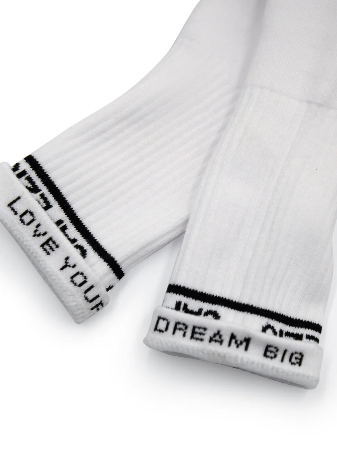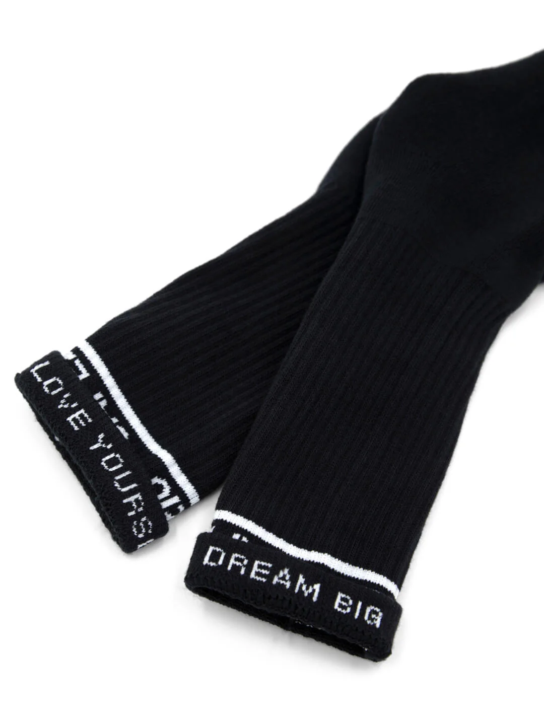 - Inside of the socks says “LOVE YOURSELF” and “DREAM BIG”